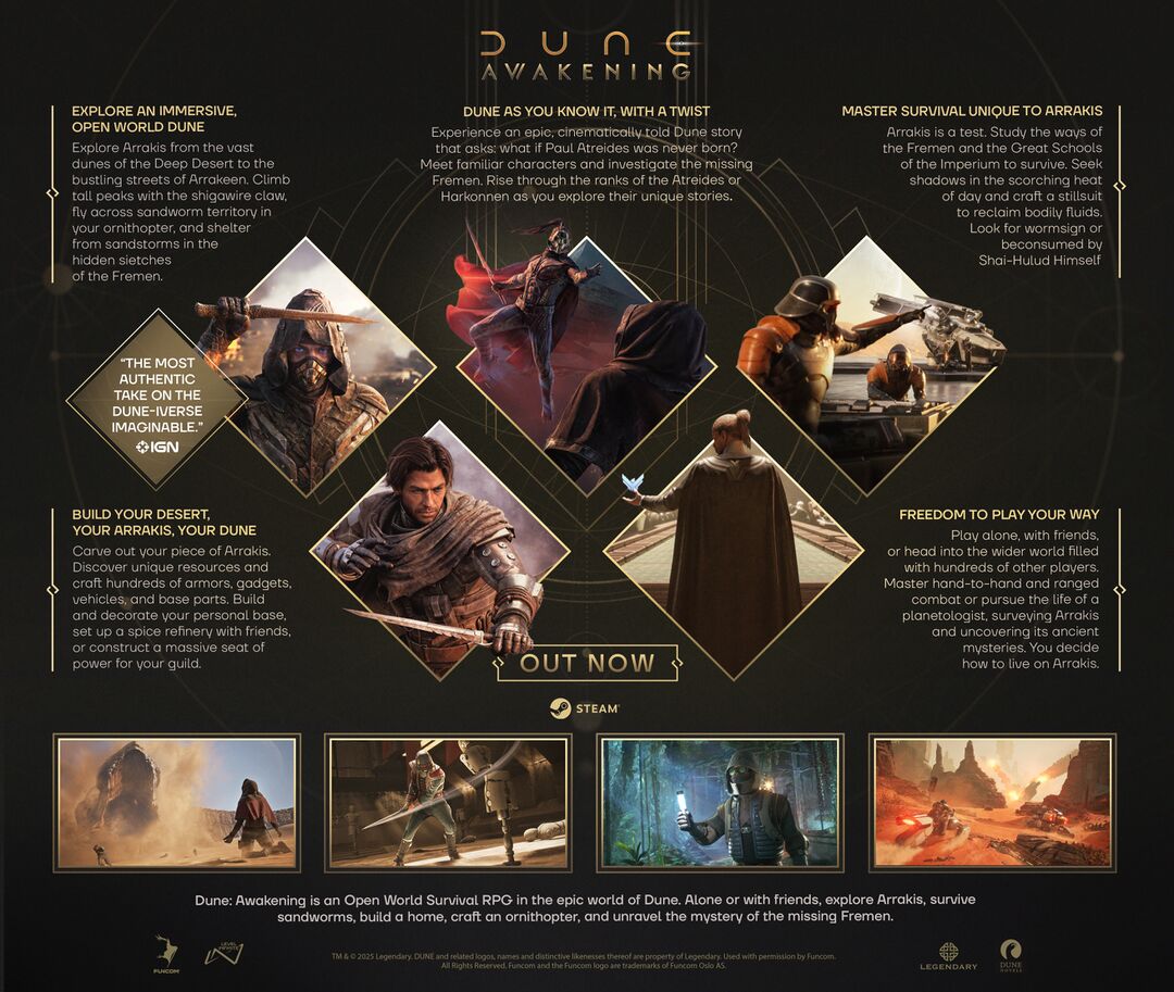 Chapter 1 (v1.1.0.0) was Dune: Awakening's launch version. The game launched into Head Start on June 5, 2025 at 16:00 CEST for players who pre-ordered either Deluxe Edition or Ultimate Edition[1], and subsequently went into Full Launch on June 10, 2025 at 16:00 CEST for all players[2].