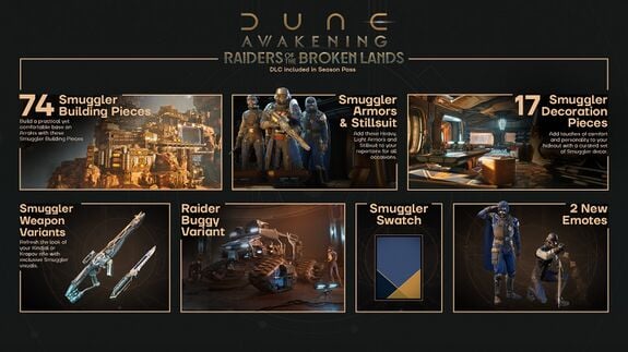 The main part of the cosmetics are the Building Pieces and Decorations, inspired by the Smugglers of the Imperium. While they often operate in the shadows, their business gives them access to more than a few luxuries. These cosmetics allow for a touch of extravagance and comfort in your life on Arrakis.