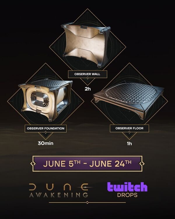 Start Date 5 Jun 2025 End Date 8 Jul 2025 Criteria Watch a Twitch streamer playing Dune: Awakening for up to 2 hours Rewards ALL REWARDS BELOW CAN BE PURCHASED FROM SOCIAL HUBS NOW
