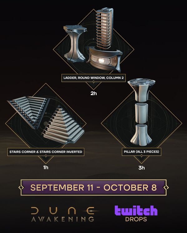 Start Date 11 Sep 2025 End Date 8 Oct 2025 Criteria Watch a Twitch streamer playing Dune: Awakening for up to 3 hours Rewards ALL REWARDS BELOW CAN BE PURCHASED FROM SOCIAL HUBS NOW