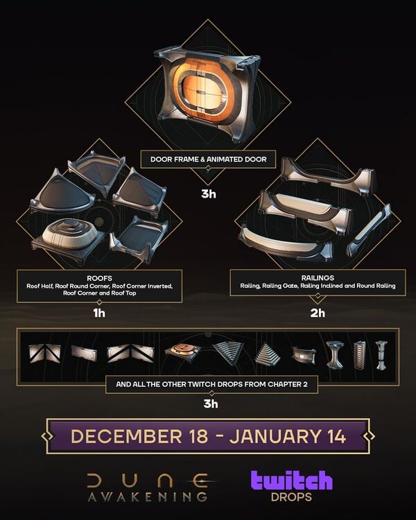 Start Date 18 Dec 2025 End Date 14 Jan 2026 Criteria Watch a Twitch streamer playing Dune: Awakening for up to 3 hours Rewards ALL REWARDS BELOW CAN BE PURCHASED FROM SOCIAL HUBS NOW
